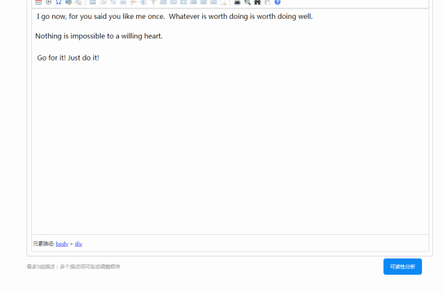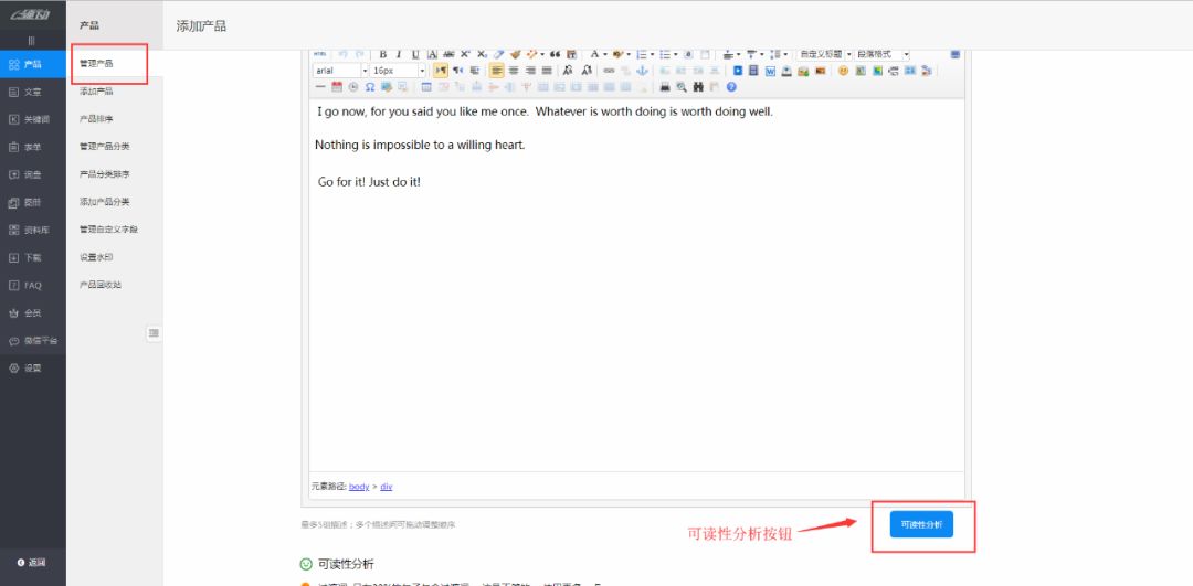 【操作方法】后台“管理产品”界面中产品描述编辑器下设有“可读性分析”按钮,单击按钮后系统即对文本内容进行分析并显示优化建议。